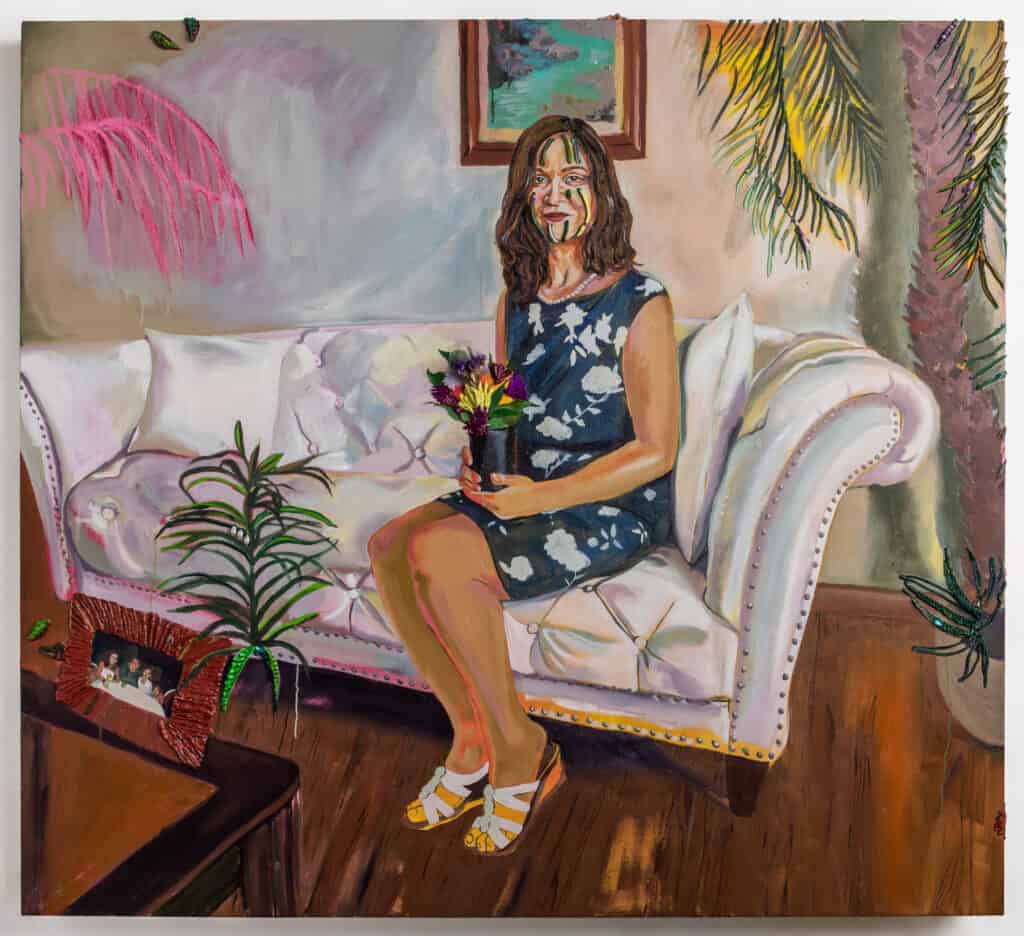 A diasporic, Indigenous CHamoru artist, McDaniel takes a multi-media approach that challenges power dynamics typically found within the practice and tradition of Euro-American portraiture; one that foregrounds the sitter as a passive object to be observed. McDaniel’s subject-collaborators are empowered to choose how they are depicted and invited to share personal belongings that are incorporated into their vibrant, three-dimensional portraits. The artist also gives agency to each sitter’s voice, incorporating into the portraits recordings of conversations had during the painting process.